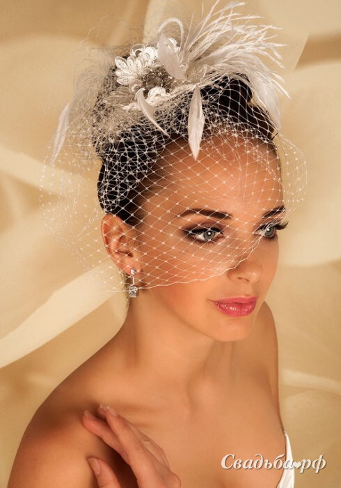 Вуаль из сетки в крупную ячейку украшена перьями и цветком, лепестки которого выполнены из кружева с кордом, а сердцевина украшена серебристой брошью из страз.