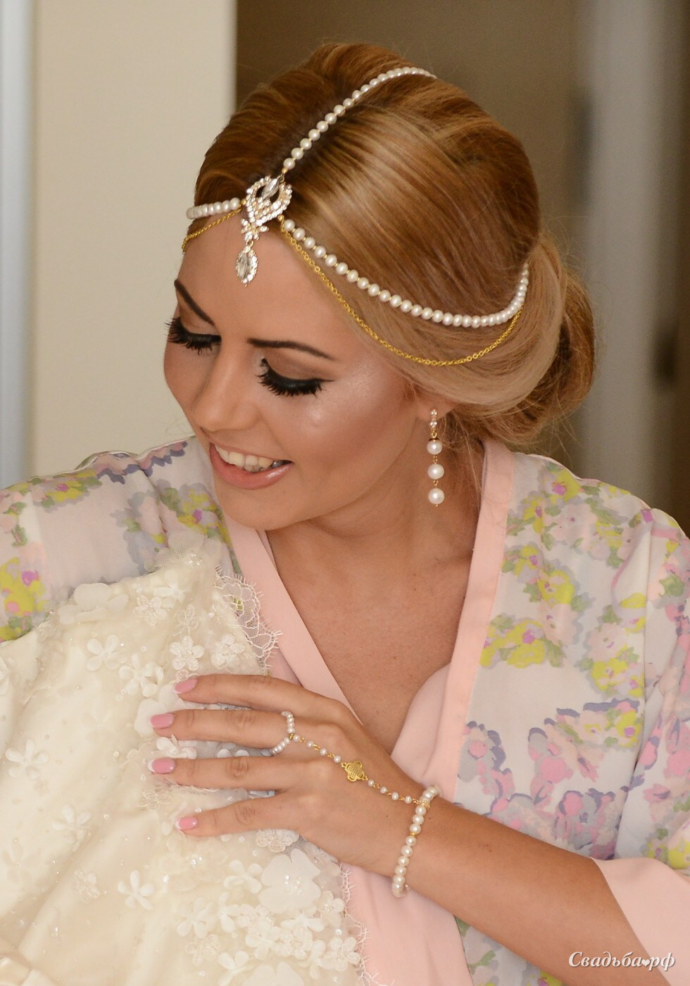 Комплект украшений из натурального речного жемчуга, ручной работы. В комплект входит: украшение на голову, серьги и слейв-браслет.