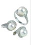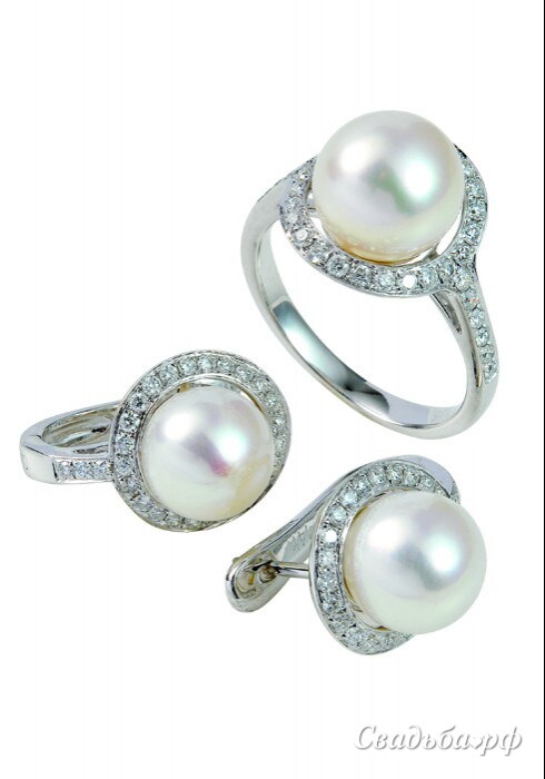 Кольцо и серьги выполнены из белого золота с жемчугом и бриллиантами
