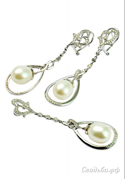 Серьги и кулон выполнены из белого золота с белым жемчугом и бриллиантами
