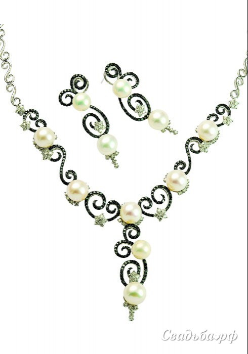 Колье и серьги из белого золота с жемчугом, черными и белыми бриллиантами