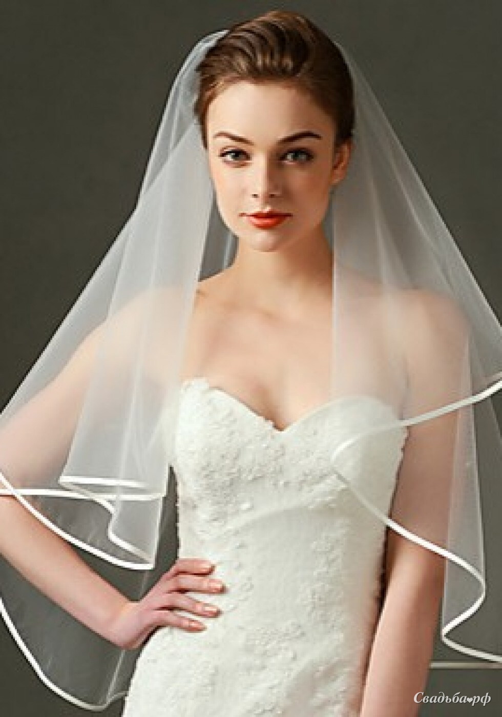 Свадебная фата средней длины. 2-х ярусная. Без гребня. Край обработан тоненьким атласным кантом.