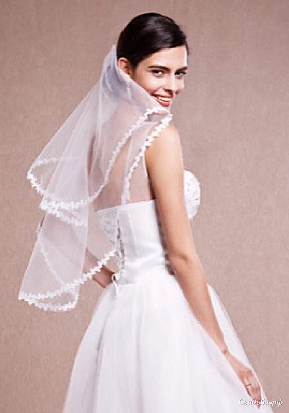 Свадебная фата. Мини-вариант. Без гребня. 2-х ярусная. По краю отделка тонкой лентой с цветочным узором. Цвет: айвори (слоновая кость).