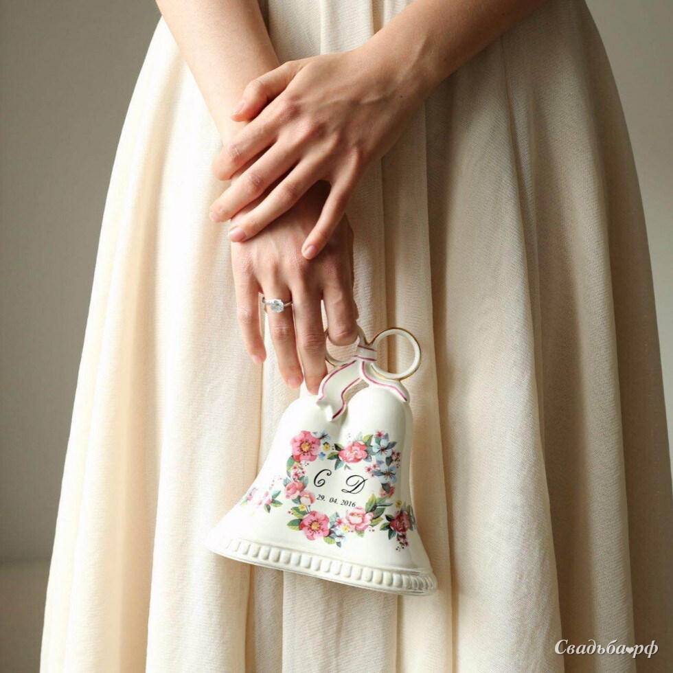 Большой именной фарфоровый колокольчик с инициалами жениха и невесты, с указанием даты свадьбы, в подарочной упаковке.