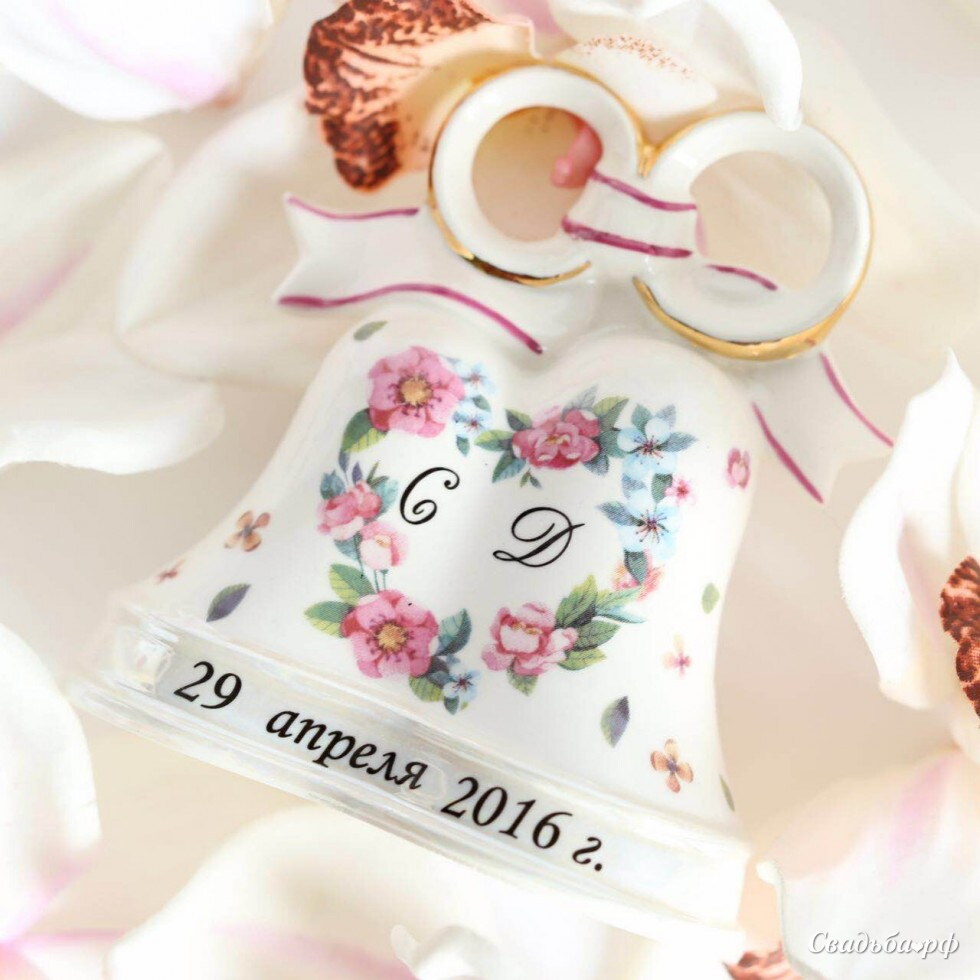 Малый именной фарфоровый колокольчик с инициалами жениха и невесты, с указанием даты свадьбы, в подарочной упаковке.