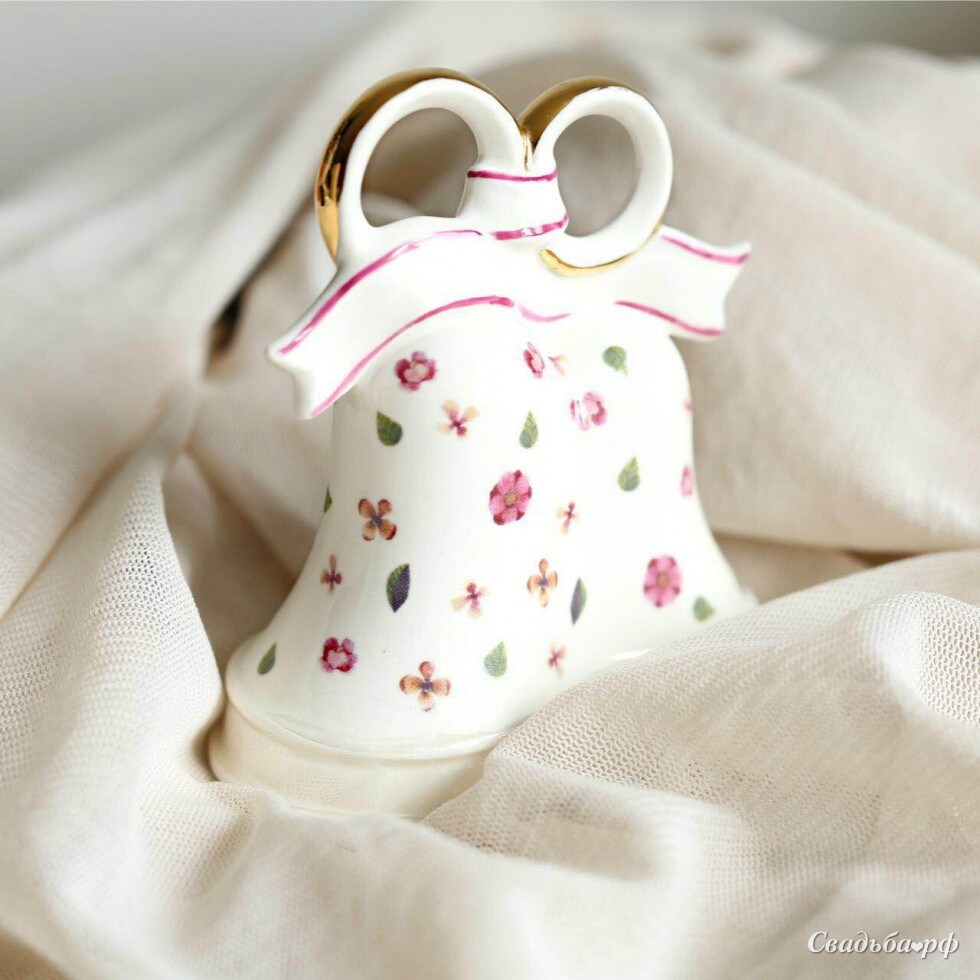 Малый именной фарфоровый колокольчик с инициалами жениха и невесты, с указанием даты свадьбы, в подарочной упаковке.