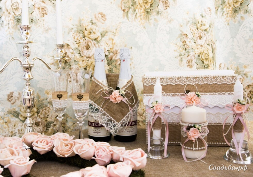 В набор входит сундук,украшение для свадебного шампанского,свадебные свечи.