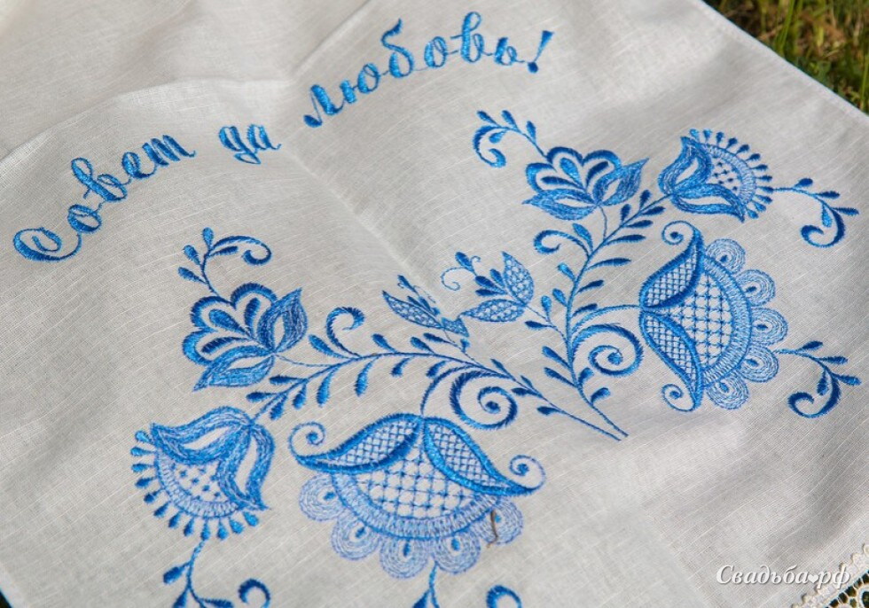 Свадебный рушник под каравай,,Мотивы,, в голубой вышивке.материал натуральный 100% хлопок