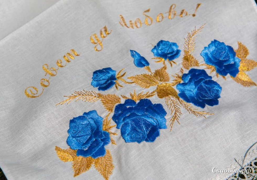 Свадебный рушник под каравай ,,Роза,,в сине-золотом.материал натуральный 100% хлопок