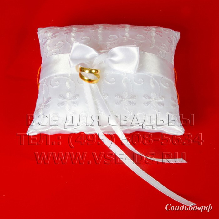 Арт.105-063 Подушечка квадратная белая, с атласной лентой, кружевом и бантом.