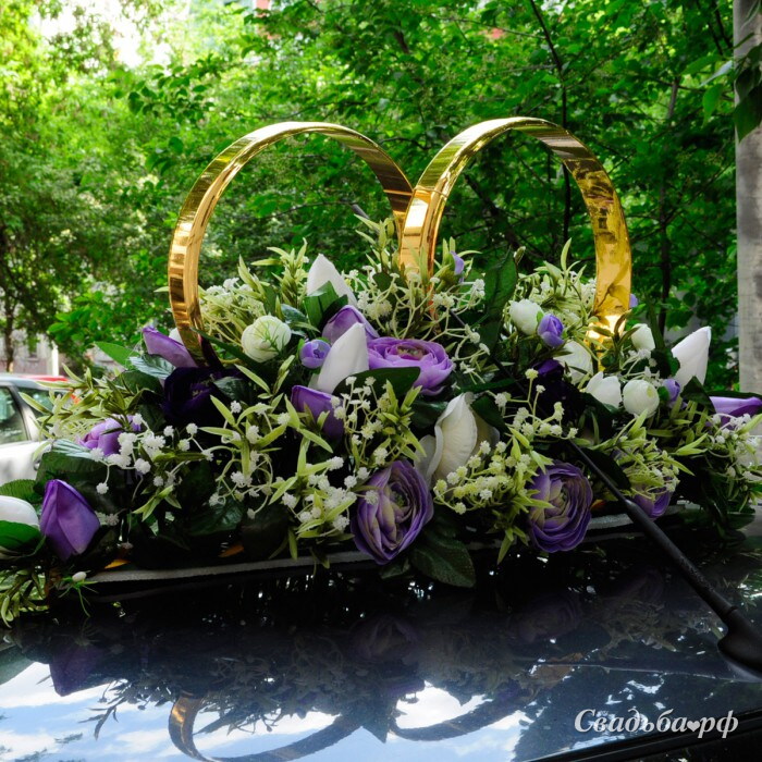 Кольца на машину крепятся при помощи атласных лент (1,5 м,которые идут в комплекте)в салон за средние стойки автомобиля.Данное украшение является безопасным для лакокрасочного покрытия и не портит его.
