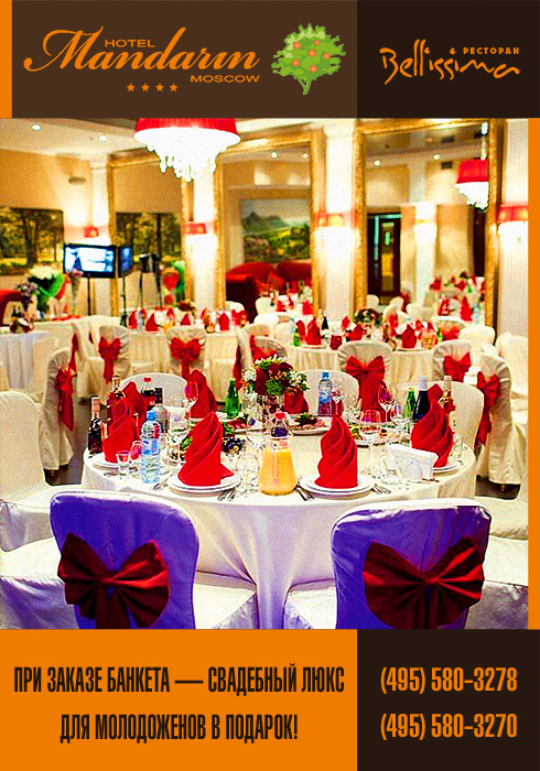 Воспоминания о свадьбе, проведенной в ресторане Bellissima при отеле "Мандарин", останутся яркими и неповторимыми, как первое "ЛЮБЛЮ". Роскошный интерьер подчеркнет важность статуса свадебного торжества. У нас вы также можете провести все виды банкетов, фуршетов и презентаций.