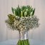 Нежнейший свадебный букет состоящий из белоснежных тюльпанов в окружении озорных берзилий и россыпи гипсофил подойдет к тонкому и аристократичному образу невесты, в котором преобладают простые вертикальные линии, а так же мягкое очарование атласа и шелка.