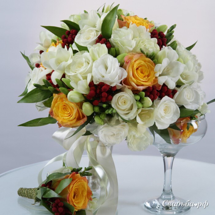 Изящный белоснежный свадебный букет с изюминкой в виде ярко желтых роз и красных берзилий доставит незабываемое удовольствие и сделает загадочным и восхитительным образ любой невесты.