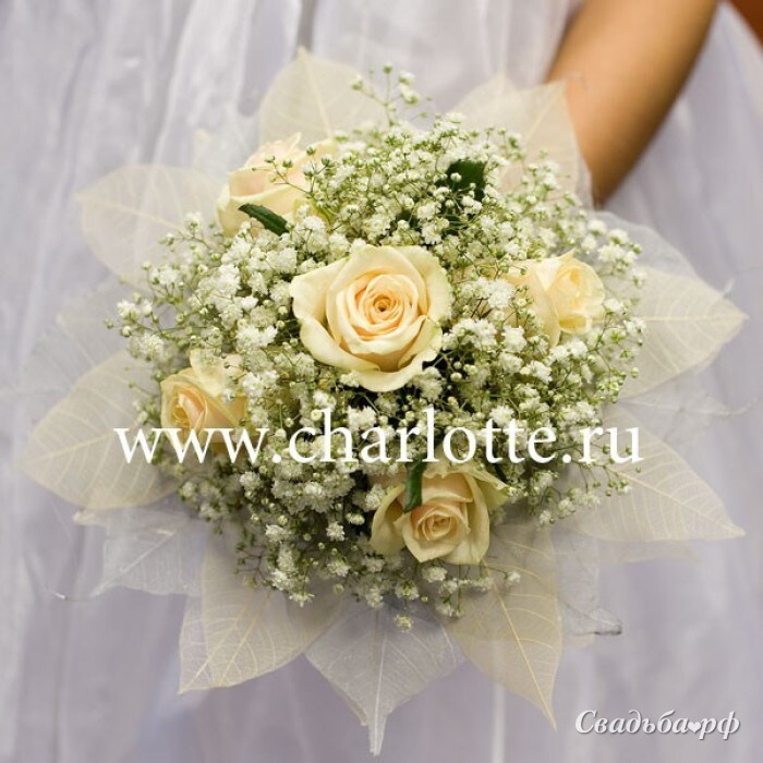 Букет, собранный на портбукетнице из кремовых роз, гипсофилы, в качестве декора использованы скелитезированные листья. Если Вы хотите изменить тона букета, звоните нашим операторам по телефону.