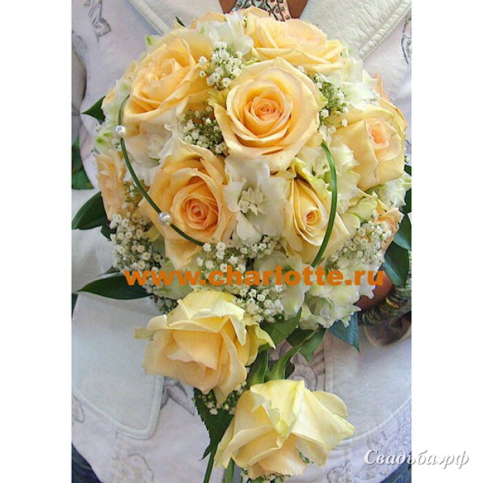 Букет невесты из роз "рената" вытянутой формы с нежным дельфиниумом и гипсофилой. Букет украшен бижутерией, по вашему желанию можно изменить цвет бусинок или убрать их вообще. Цвет роз и форму букета так же можно изменить, например: сделать его более вытянутым или просто круглым.