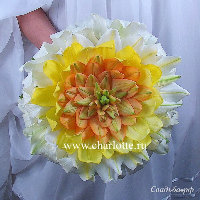 Очень красивый и необычный свадебный букет "Гламелия". Букет сделан из лепестков лилий желтого, оранжевого и белого цвета. Возможно изменение цветовой гаммы букета, также возможен вариант гламелий из роз различного цвета.