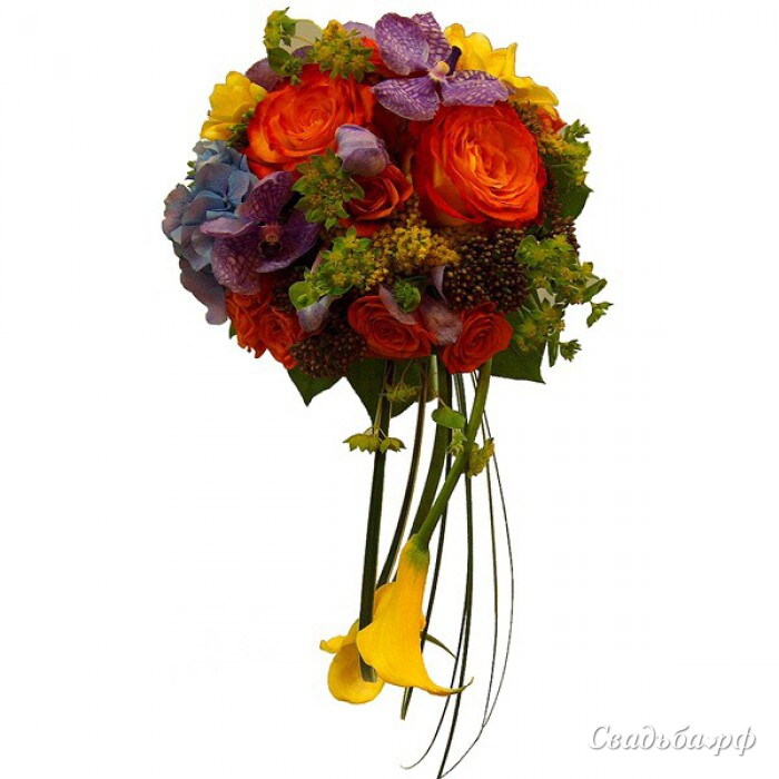 Букет невесты в ярких тонах из роз, орхидей "Ванда", фрезий, калл с декоративной зеленью. Очень оригинальное и нестандартное решение для свадебного букета, подходит девушкам, которые не боятся выделяться.