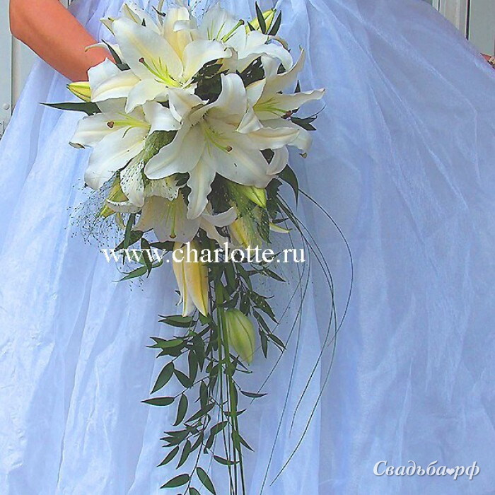 Букет невесты каскадной формы из белых лилий. Размер такого букета 25*35.