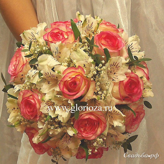 Букет невесты в бело-розовых тонах классической формы. По Вашему желанию букет может быть украшен бижутерией.