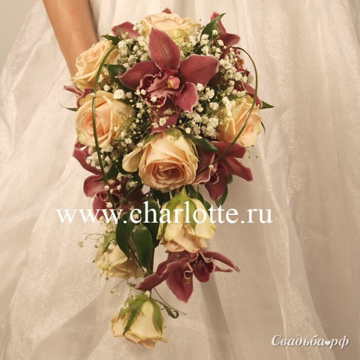 Каплевидный букет из чайных роз, бордовых орхидей, гипсофилы, декоративной зелени.