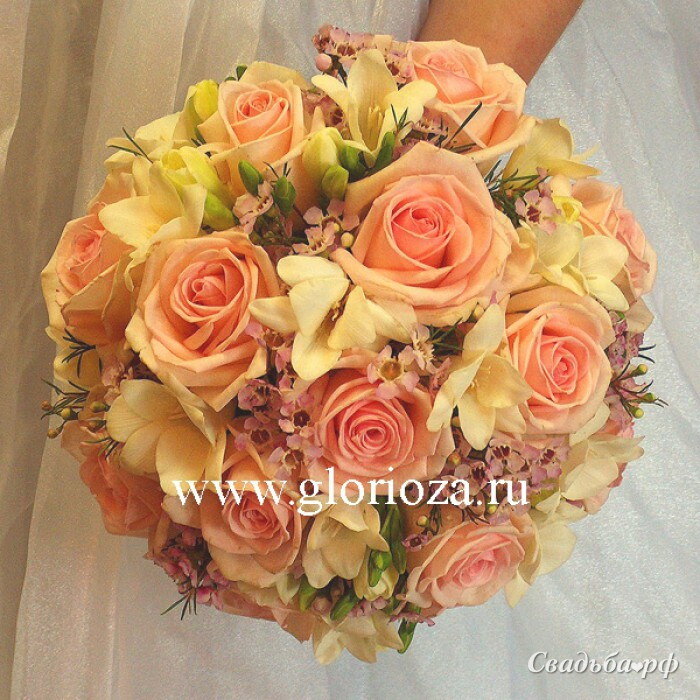 Букет классической формы на портбукетнице. Прекрасное сочетание нежно-розовых роз и белых фрезий.