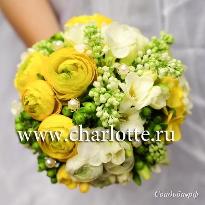 Букет невесты "Elegance Yellow" в желто-белых тонах из ранункулусов, фрезий, сирени, гиперикума с элементами декора на портбукетнице. Если Вы хотите изменить тона букета, звоните в наш салон цветов.