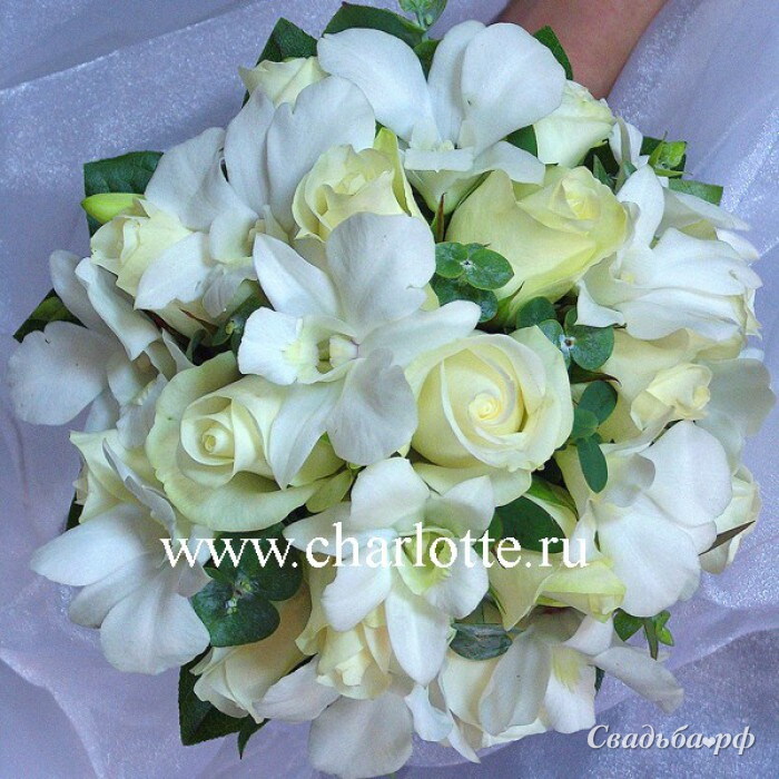 Экзотическая орхидея утонула в небольших белых розах и гипсофиле. Букет украшен бижутерией в виде жемчуга. В состав букета невесты входят розы "акито" 17 шт., гипсофила и орхидея. По желанию заказчика цвет роз можно изменить, для этого свяжитесь с нашими операторами по телефону.