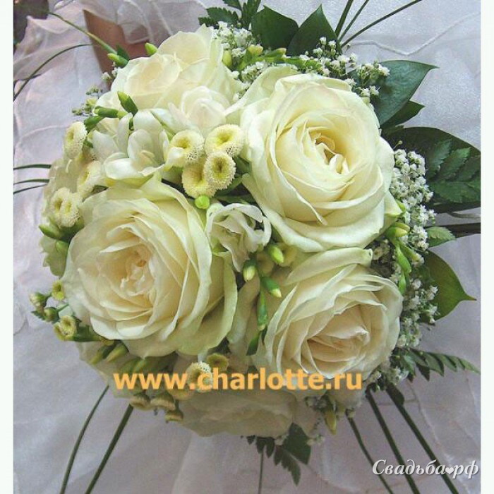 Букет невесты "Кокетка" округлой формы из крупных белых роз, приятно-пахнущей фрезии. По кругу стоит декоративная зелень (берграсc), которая придает букету легкость. По вашему желанию можно изменить форму букета (сделать ее каплевидной и др.), цвета тоже можно изменить, предварительно созвонившись с нашими операторами по телефону.