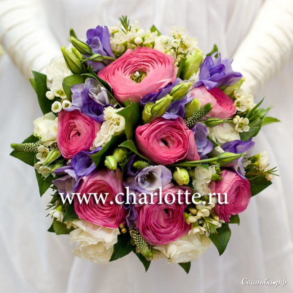 Букет невесты из розовых ранункулусов, фиолетовой фрезии, белого лизиантуса, вероники, восковника, зелени с лентой.