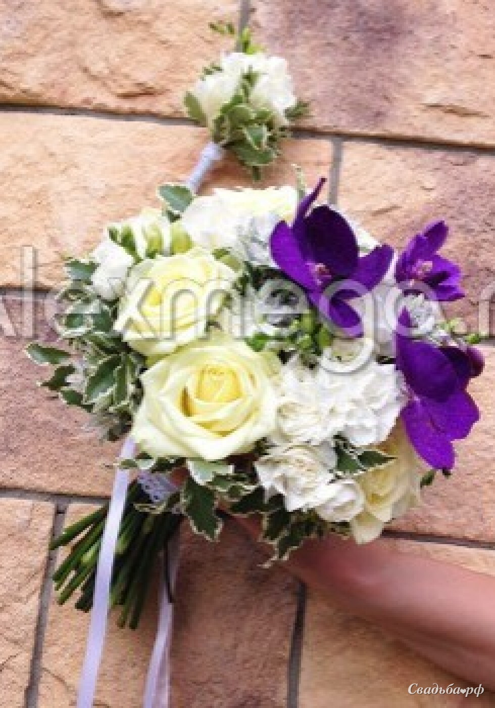 Роза Аваланш, фрезия белая, гвоздика белая, гвоздика кустовая, трителия сизая, питоспору Нигра, орхидея Ванда, декор
