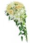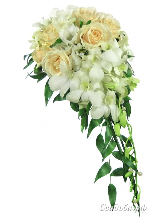 Каскадный букет в бело-кремовой гамме из роз и орхидеи. Букет декорирован бусинками в тон роз.