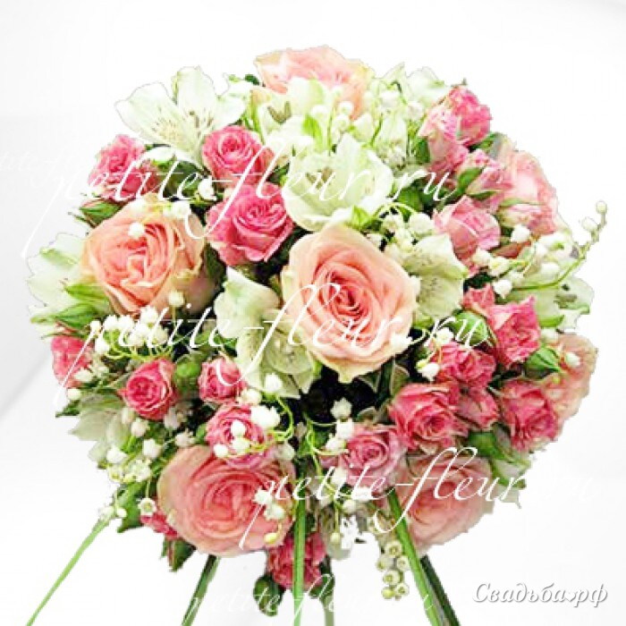 Идеально круглый, нежный, весенний букет из роз, альстромерии и ландышей.