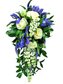 Удлиненный букет-капелька в бело-синих тонах из роз Аваланж, белоснежной сирени, ирисов, вероник, трахелиума и зелени рускуса итальянского