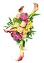 Оригинальный асимметричный букет из калл, фиолетовой орхидеи Ванда, кремовых и персиковых роз и гиацинтов с зеленью рускуса.
