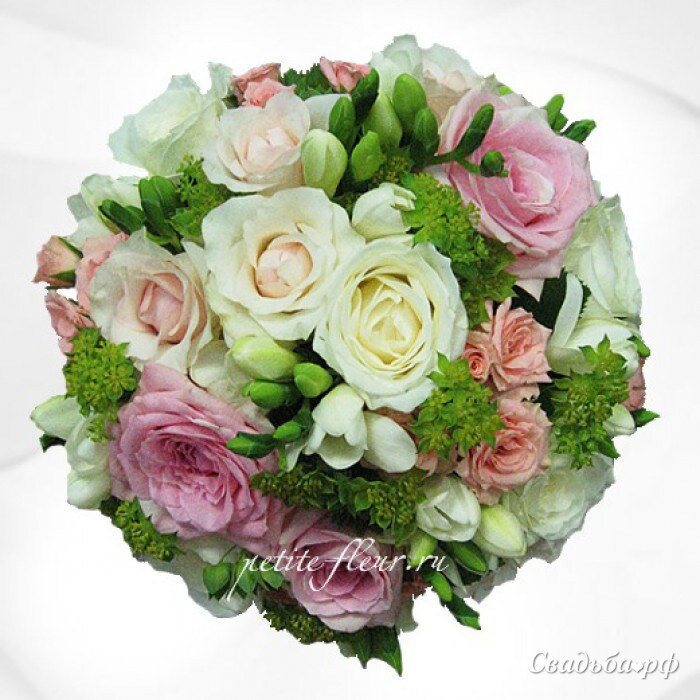Классический круглый букет из розовых, кремовых и персиковых роз, буплерума и фрезий