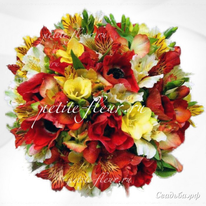 Яркий, нарядный букет из красных, желтых и лимонных альстромерий, анемонов и фрезий.