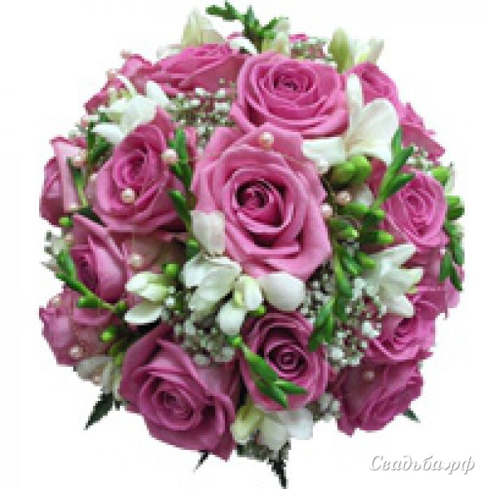 Обаятельный букет из ярких роз, нежнейших фрезий, веточек гипсофилы с добавлением зелени!