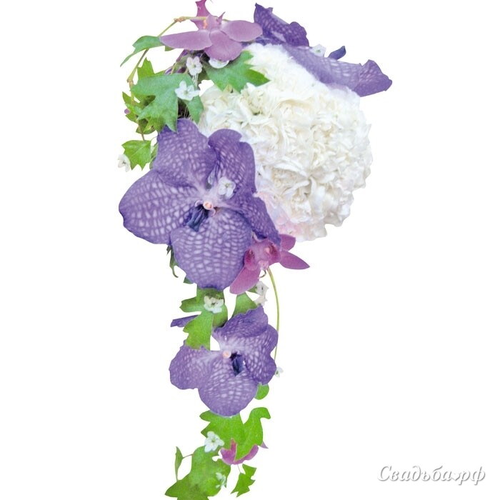 Оригинальный, стильный букет на портбукетнице.Шар выполнен из белой кустовой гвоздики, изящная ниспадающая линия из цветов орхидем дендробиум и орхидеи ванда обрамляет шар и создает контраст с ним по фактуре и цвету.