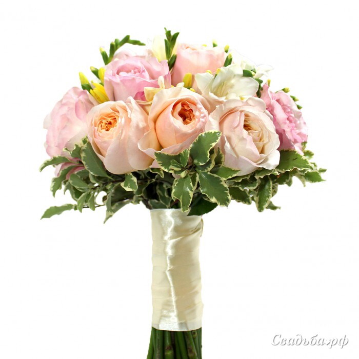Букет невесты из французских, садовых роз и фрезий, с нежнейшим ароматом! Пионовидные розы от Дэвида Остина имеют очень приятный запах, а в сочетании с фрезией такой букет подарит уникальный аромат и незабываемое впечатление.