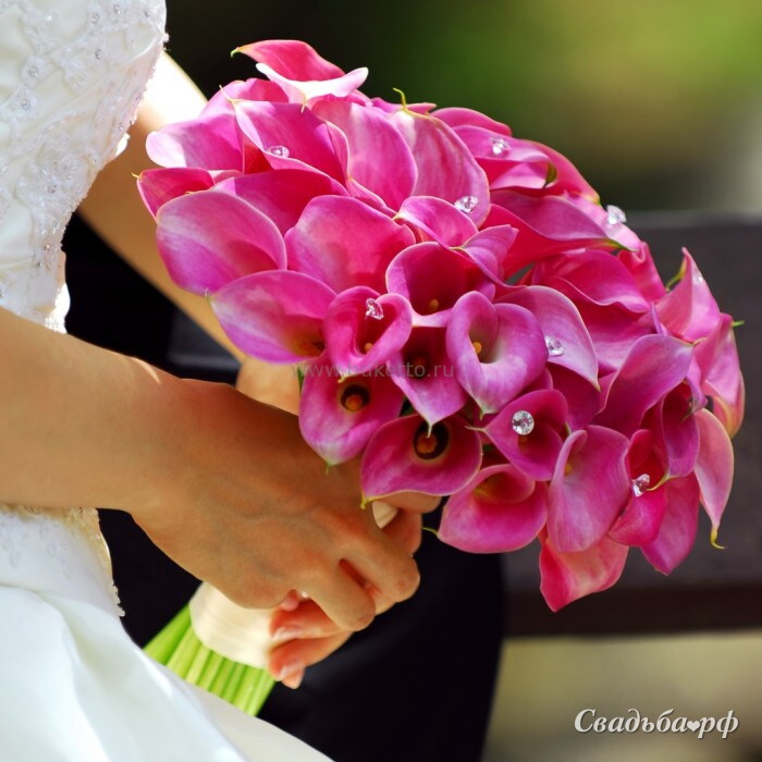 Шикарный стильный букет из 39 калл на естественных стеблях. Изящные кристаллы дополняют цветовую гамму букета и придают работе современное звучание.