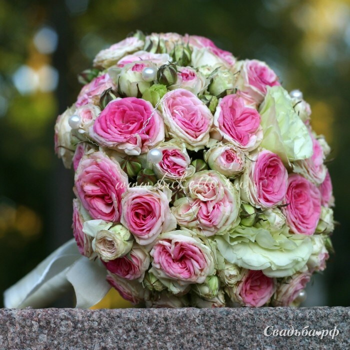 Изящный, небольшой букет из кустовых рох сорта "Mimi Eden" и лизиантуса.