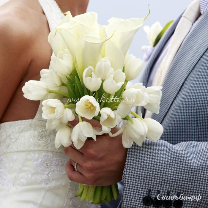 Элегантный букет из белых калл и тюльпанов олицетворяет мужское и женское начало.