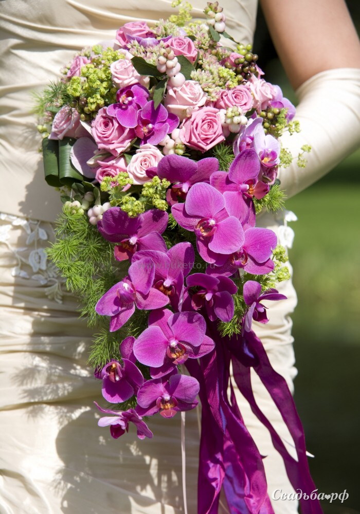 Роскошный, мягко струящийся ниспадающий букет из орхидей "фаленопсис", роз сорта "хэвен", зелени и снежноягодника покорит любую девушку! Эта работа выполнена в английской технике тейпирования, поэтому достаточно легка по весу.
