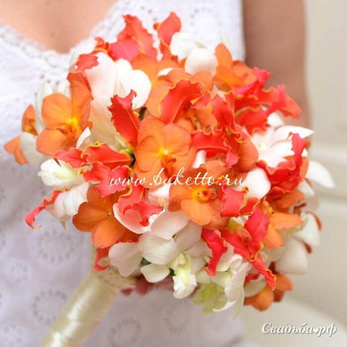 Яркий нежный экзотический букет из цветов глориозы, орхидей сортов Ванда и Денробиум. Букет-дублер и бутоньерка для жениха - в подарок!