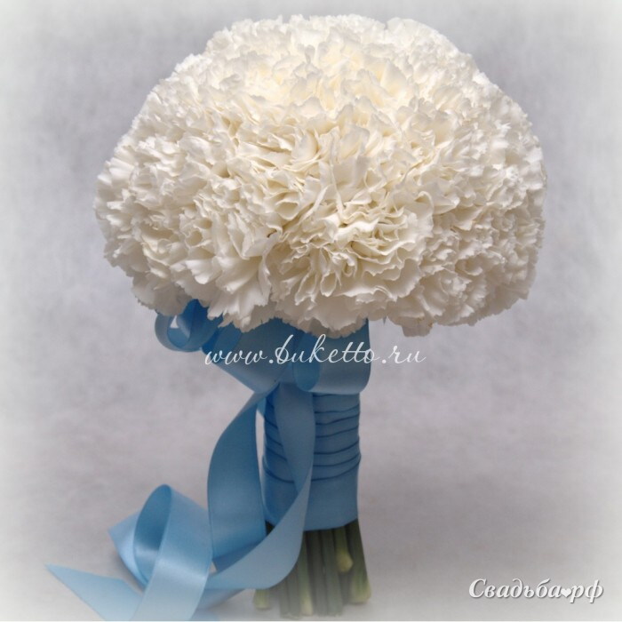 Букет невесты "Белоснежка". Код 549. Легкий ажурный букет из гвоздик бело-молочного тона. Букет-дублер и бутоньерка для жениха - в подарок!
