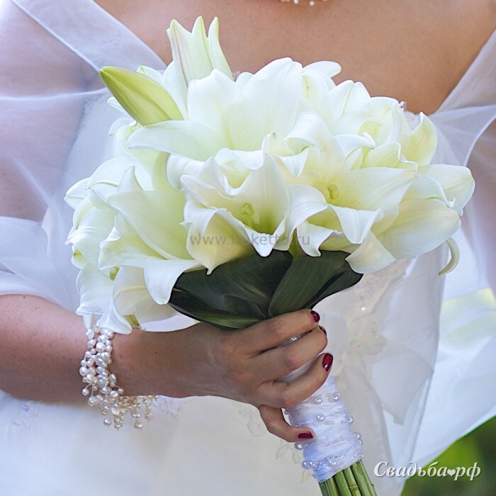 Белые лилии как символ чистоты и невинности невесты будут актуальны в свадебной флористике всегда. Монотипический букет на естественных стеблях, дополненный зеленью - воплощение классической элегантности. Букет-дублер и бутоньерка для жениха - в подарок!