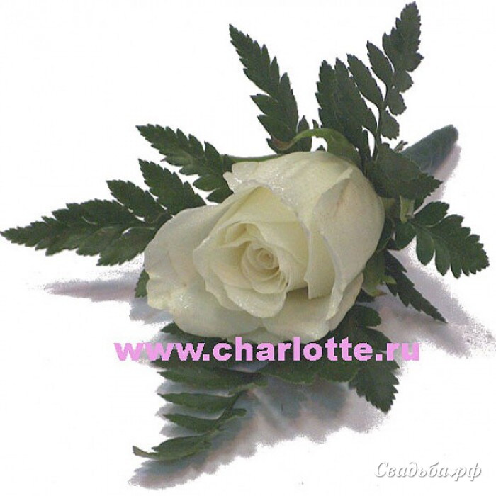 Бутоньерка для жениха из белой розы в обрамлении зелени.