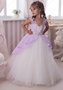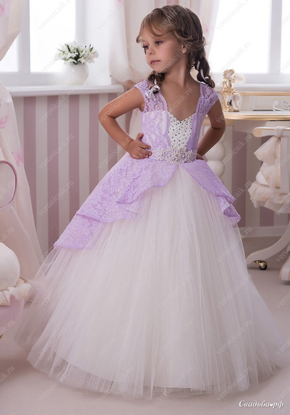 Кружевное платье с кружевной сиреневой накидкой.