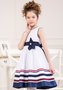 Нарядное универсальное детское платье выполнено из хлопковой белой ткани с отделкой из красной и темно-синей тесьмы. Эта модель детского платья представлена в одном цветовом решение, как на фото. Лиф детского платья приталенный, линия талии слегка завышена, круглая горловина и проймы рукавов отделаны узкой тесьмой синего цвета, сзади застежка-молния, подкладка из хлопка. Юбка присборена по верхней линии отреза, низ юбки отделан контрастной тесьмой синего и красного цвета. На талии широкий синий пояс - впереди украшен декоративным цветком из ткани, сзади завязывается в бант и регулирует объем платья.